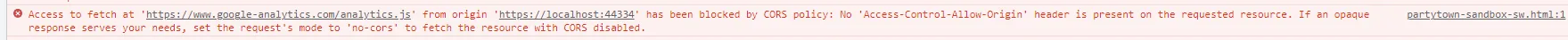 In order to not run into CORS issues, it seems Partytown suggest to use a reverse proxy on your own domain. In .NET Core you can use YARP to simply forward requests to a remote endpoint.